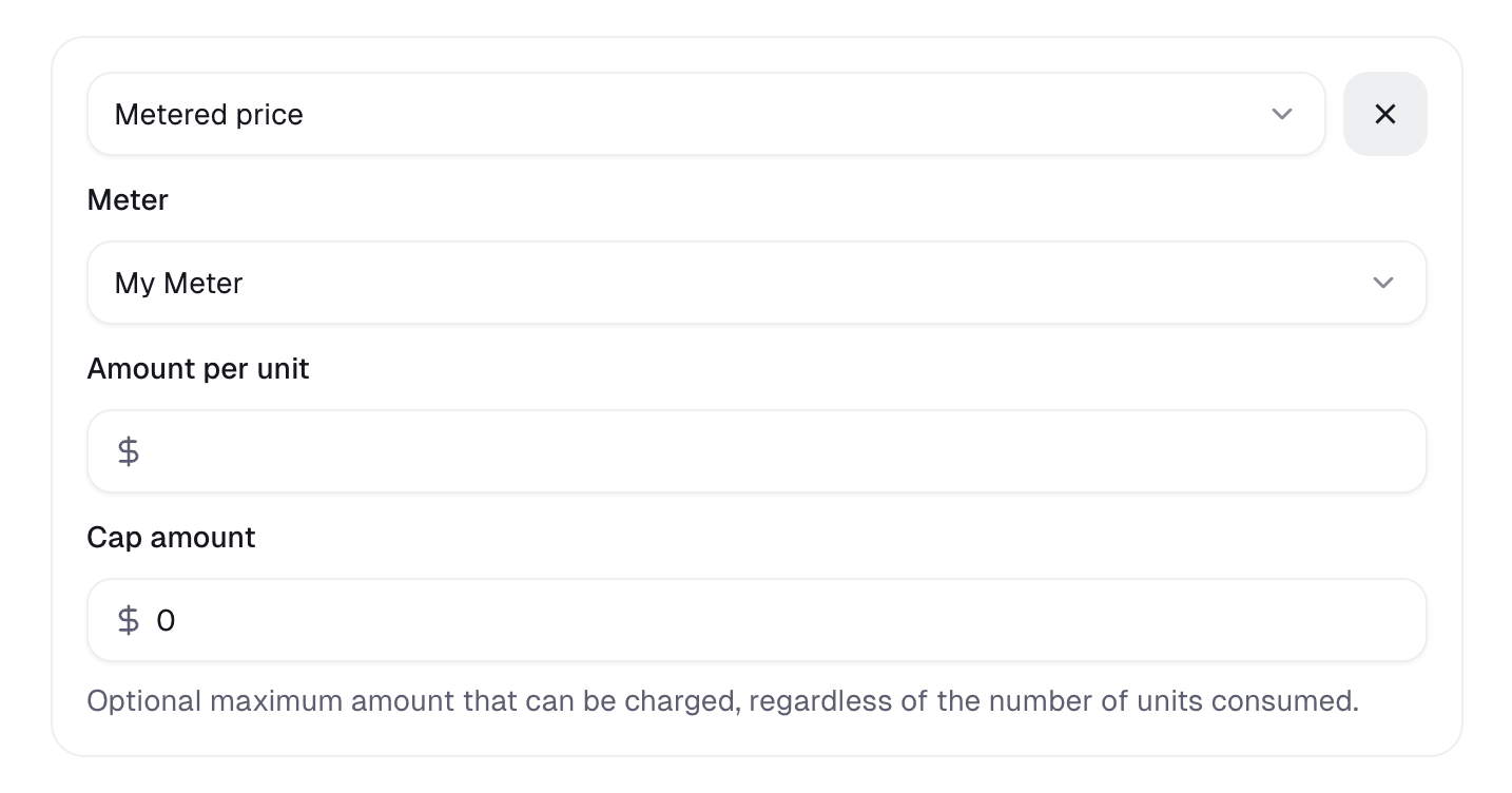 To charge your customers for usage, you need to add a metered price to your product. You’ll need the select the Meter and the amount per unit.